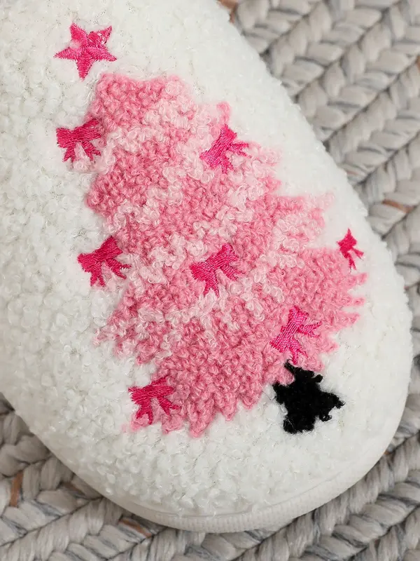 Christmas Plush Slippers, Creative Bowknot Embroidered Tree Design