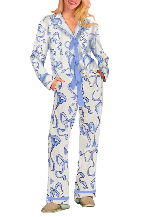 Fashionable Christmas Holiday Lapel Neck Bow Neck Women Pajams Set