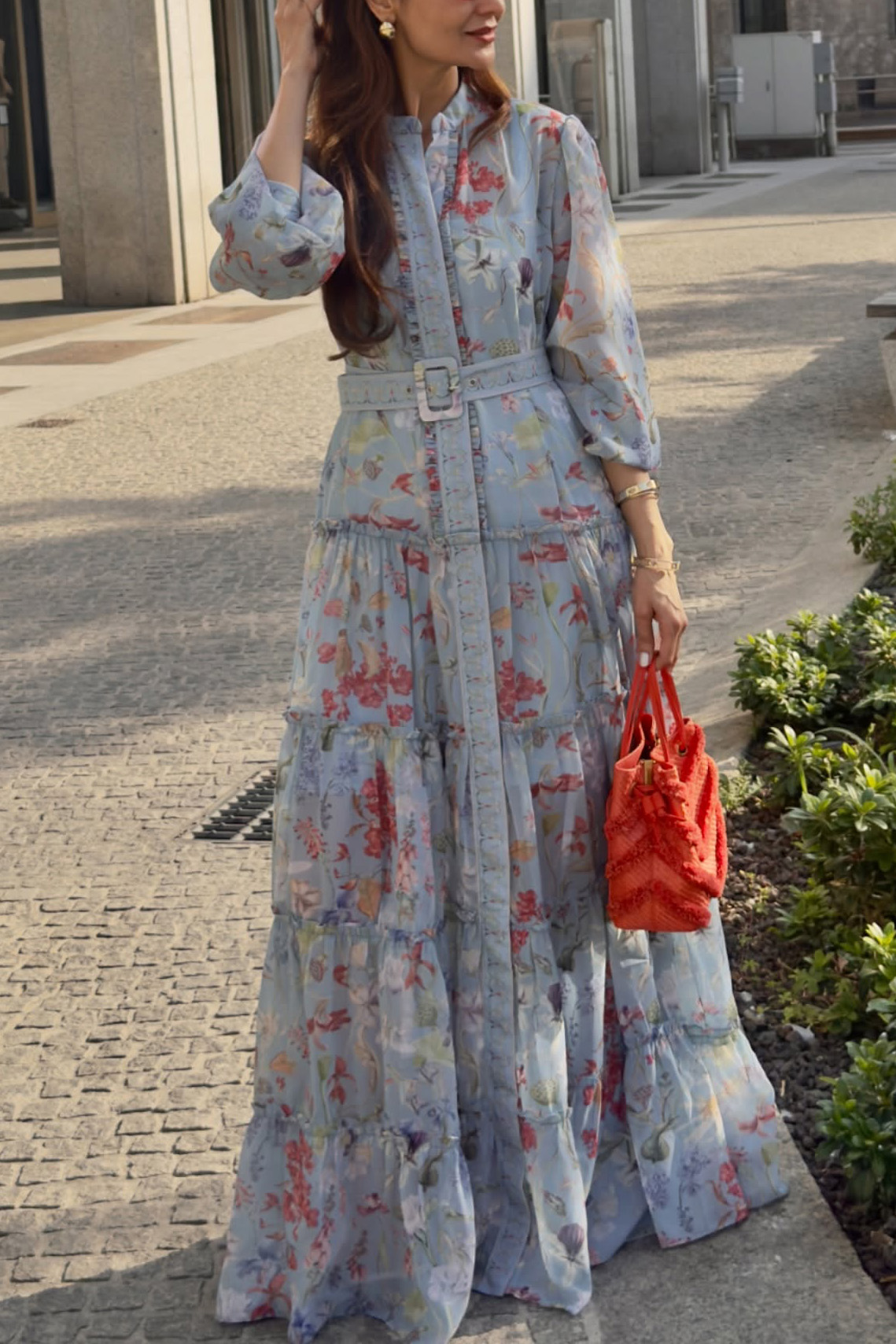 Elegant Pleated Gathered Floral Print Maxi Dress