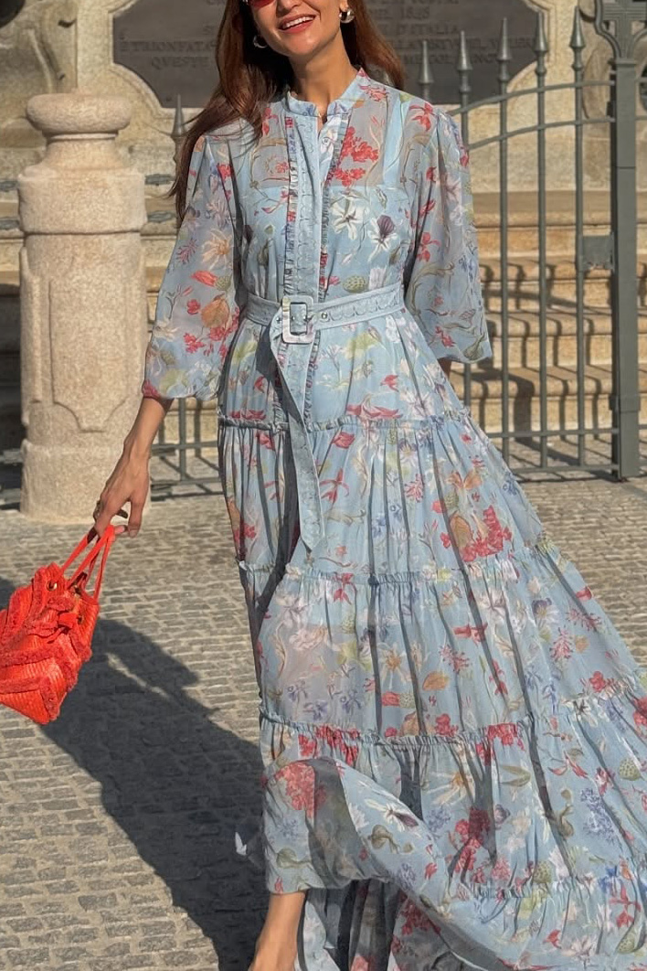 Elegant Painted Floral Print V-Neck A-Line Maxi Dress