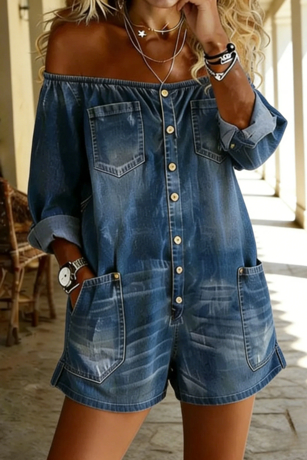 Women's Casual Cotton Denim Off-Shoulder Jumpsuit Shorts