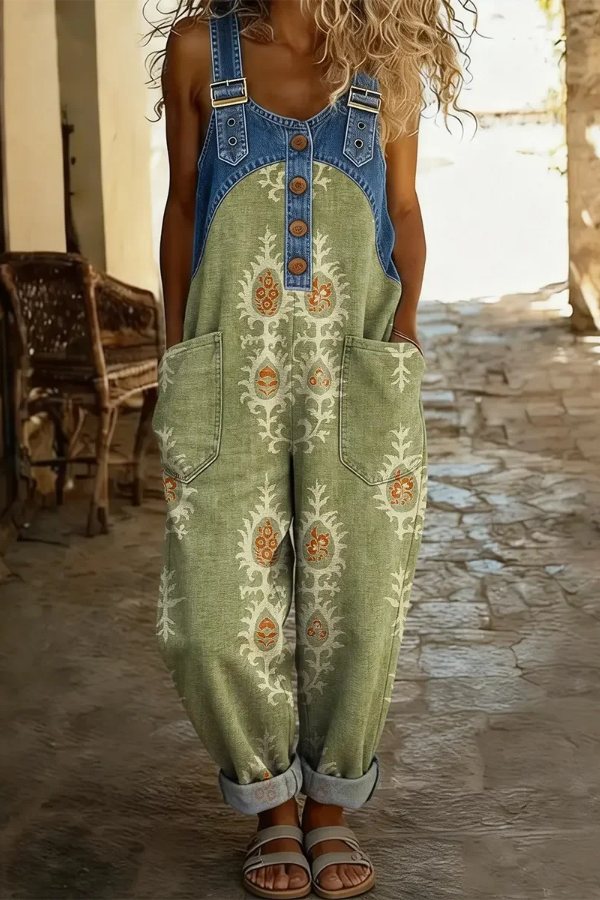 Ethnicity Totem Pattern Light Green Women's Casual Washed Cotton Denim Patchwork Jumpsuit