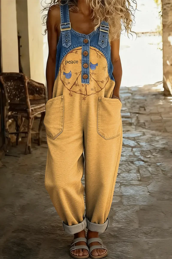 Women's Hippie Peace Bird Art Print Patchwork Denim Overalls