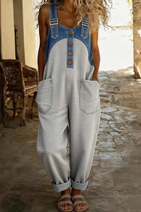 Women's Casual Washed Cotton Denim Patchwork Jumpsuit