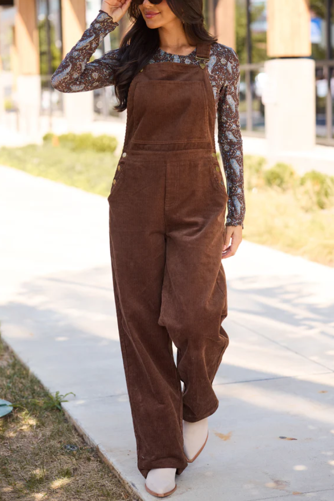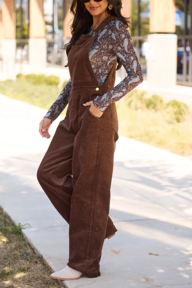 This warm brown corduroy overalls bring cozy, retro charm to your wardrobe. Crafted from soft corduroy fabric, the relaxed wide-leg fit offers all-day comfort—perfect for casual outings or weekend errands. Pair it with a printed long-sleeve top (like the floral one here) for a laid-back, stylish look that balances vintage vibe and modern ease. A versatile staple that works for any season.