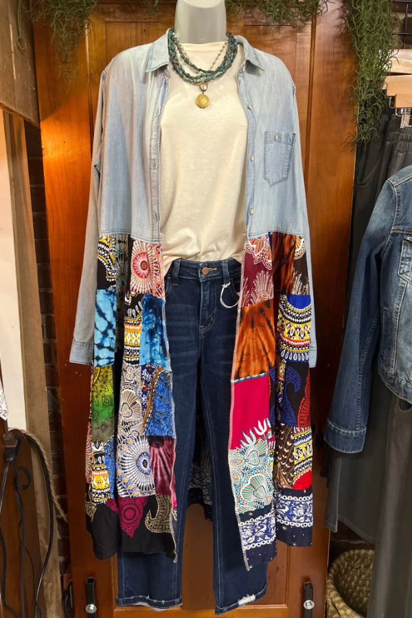 - Upcycled from a denim jacket and fabrics hand