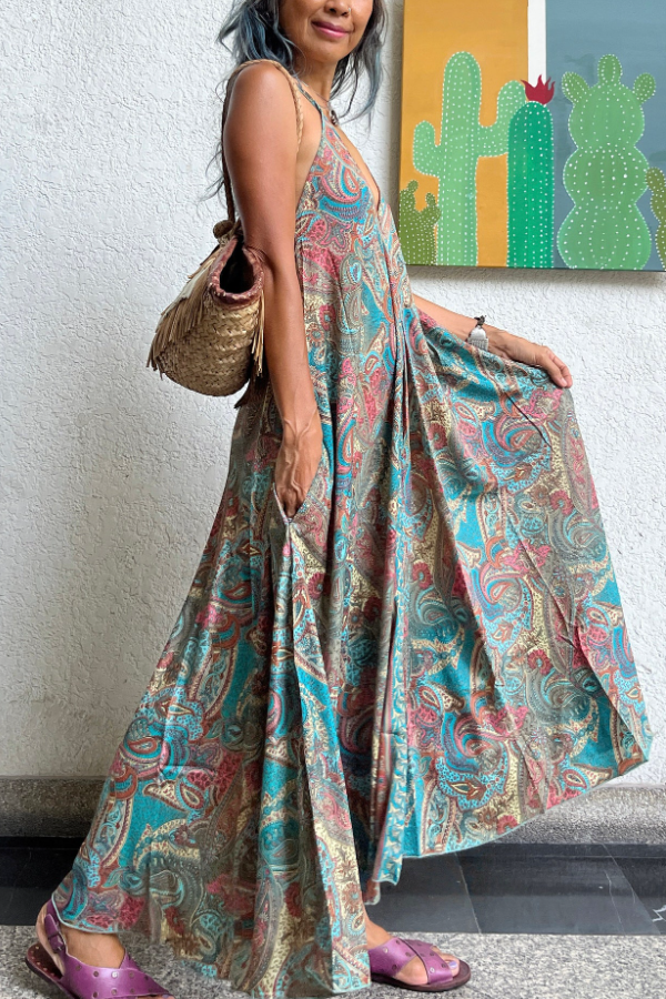 Deep V-neck and spaghetti strap design: Thin straps and a deep V-neck flatter the shoulders and neck, elongating the neckline and revealing the collarbone for a sexy yet elegant look that avoids being overly revealing and minimizes the appearance of a bulky upper body. The oversized A-line silhouette: The loose, flowing cut throughout the dress provides unrestricted comfort for the waist, hips, and legs, concealing imperfections and creating a slimming effect. It's suitable for all body types, including plus-size, pear-shaped, and apple-shaped figures, offering a relaxed and comfortable fit without clinging to the body.