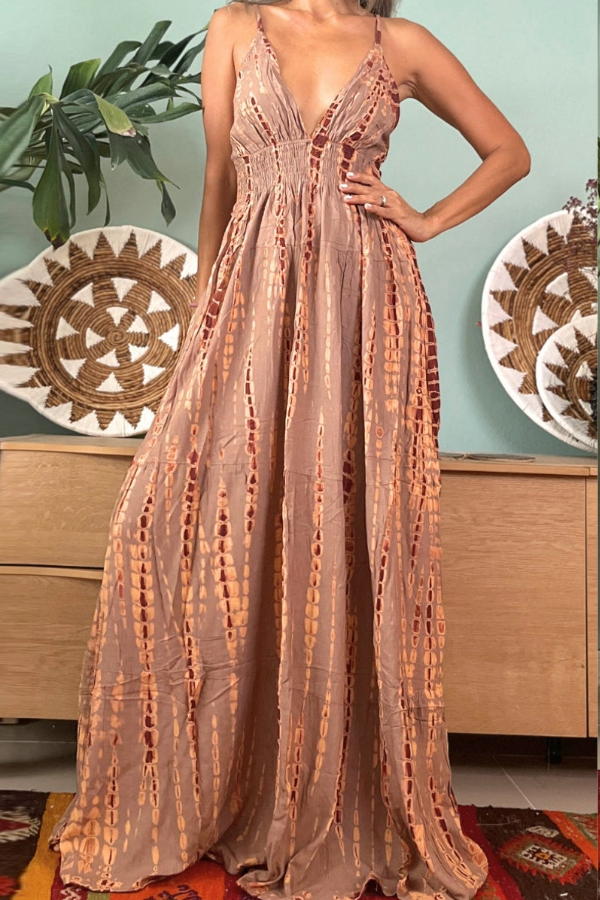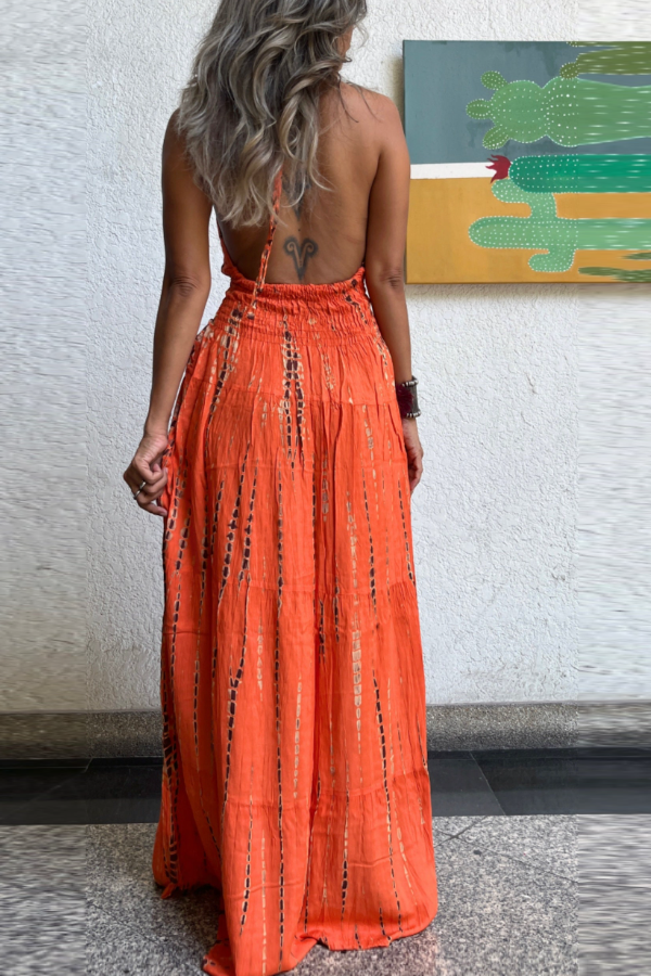 This dress features a double-threat design with a halter neck and a deep V-neck in the front, and a dramatic open back. The deep V-neck in the front flatters the shoulders and neckline, highlighting the collarbones, while the large open back showcases the shoulder blades. It's sexy and effortlessly chic without being vulgar, perfect for vacations, dates, and photoshoots, breaking away from the monotony of basic dresses.