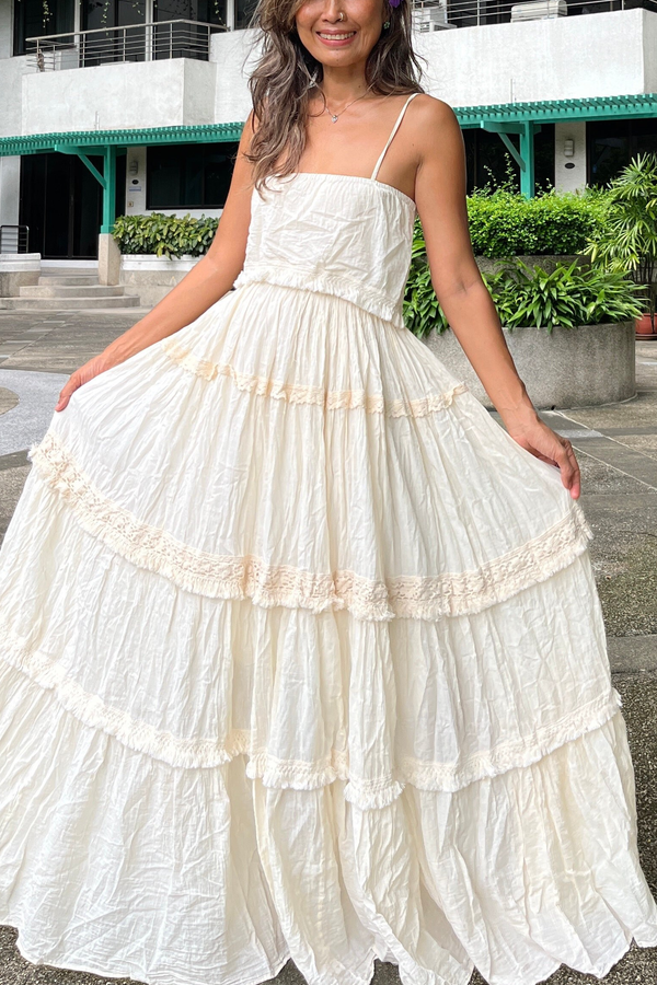 The multi-layered, segmented design and A-line silhouette, with carefully pressed pleats, create a voluminous and layered skirt that avoids the flat, limp look of ordinary long dresses. It moves gracefully with every step, giving off a princess-like and vintage feel. The visual focus is shifted downwards, creating a slimming effect and making it the defining feature of the dress—a unique and distinctive piece.