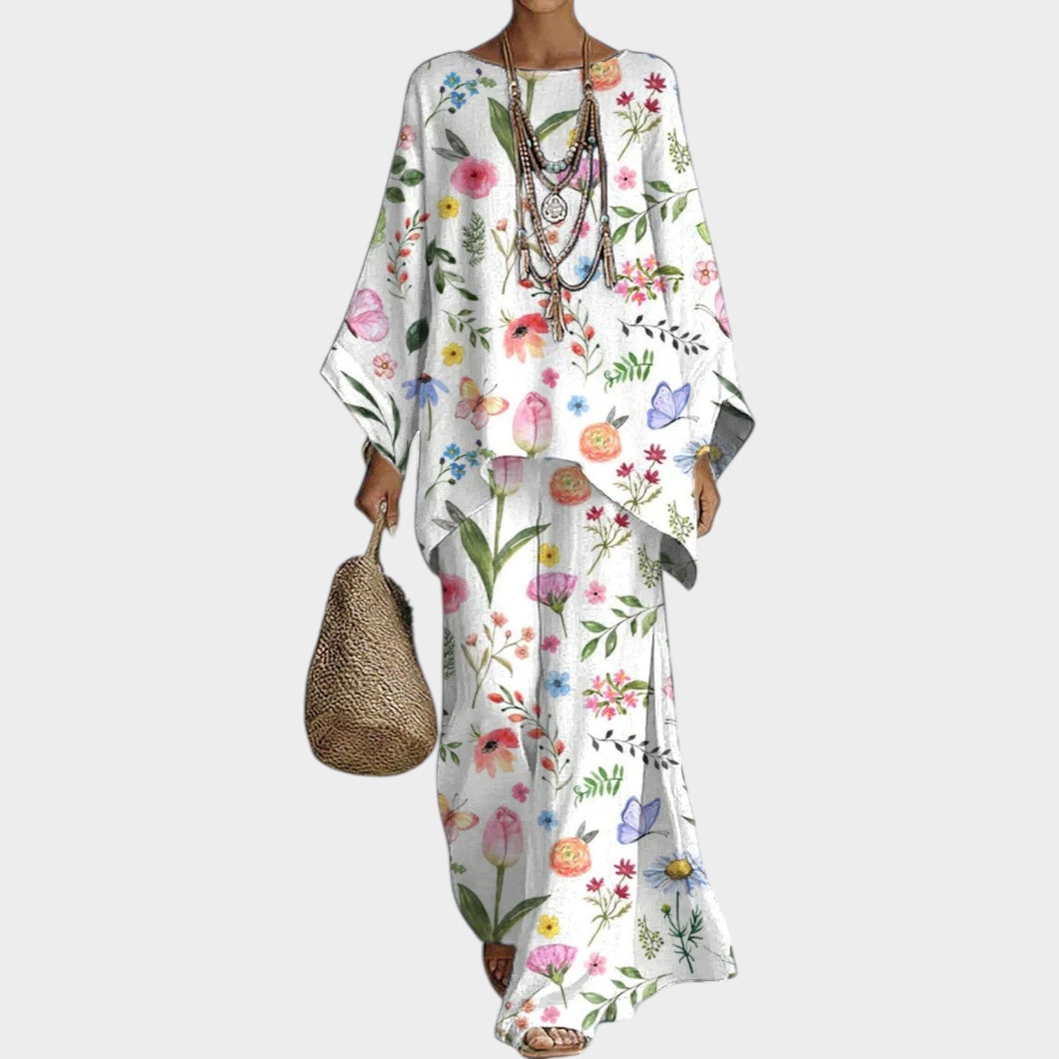 Embrace effortless elegance with this flowy two-piece ensemble featuring a relaxed top and wide-leg pants. Its nature-inspired print adds a fresh, artistic touch to your everyday wardrobe.