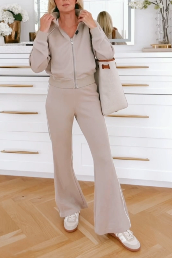 The top features a stand-up collar for a sleek look, and a zipper closure for easy on and off. The bottoms are slightly flared, flattering and elongating, showcasing elegant proportions. The overall silhouette is tailored to the body, ensuring flexibility during exercise while also highlighting a stylish look. White side trims add a touch of sophistication and depth, breaking the monotony of the solid color. The look combines retro and modern elements, making it a versatile choice for casual wear, exercise, and more. SPU:OPSY2591801 Collar: Stand Collar Sleeves: Long Sleeves Material: Knit Note: Size: please check measurements carefully Please allow 0.5-1" difference due to manual measurement Different monitor settings means colors may differ slightly 1" = 2.54cm