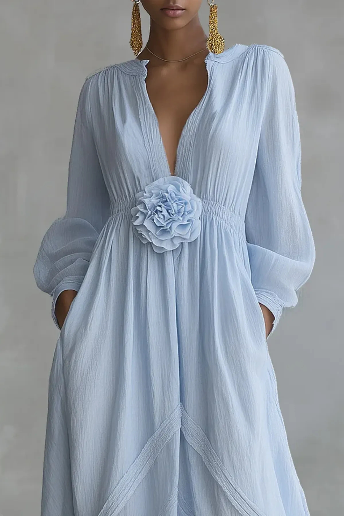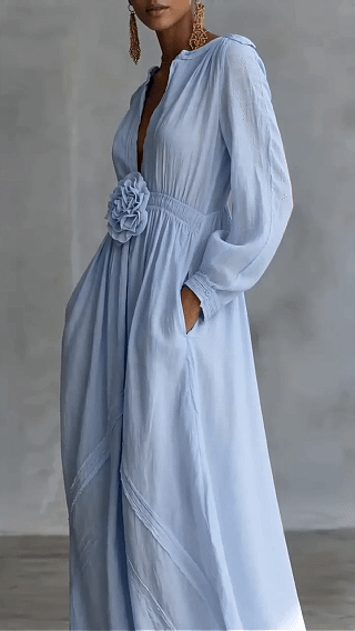 A dreamy, flowy maxi dress crafted from lightweight crinkled fabric. Features a deep V-neck, billowy long sleeves, and a statement 3D flower accent at the elastic waist for a flattering fit. Side pockets and subtle stitched details add both charm and practicality. Available in multiple soft hues, perfect for weddings, vacations, or elegant boho styling.