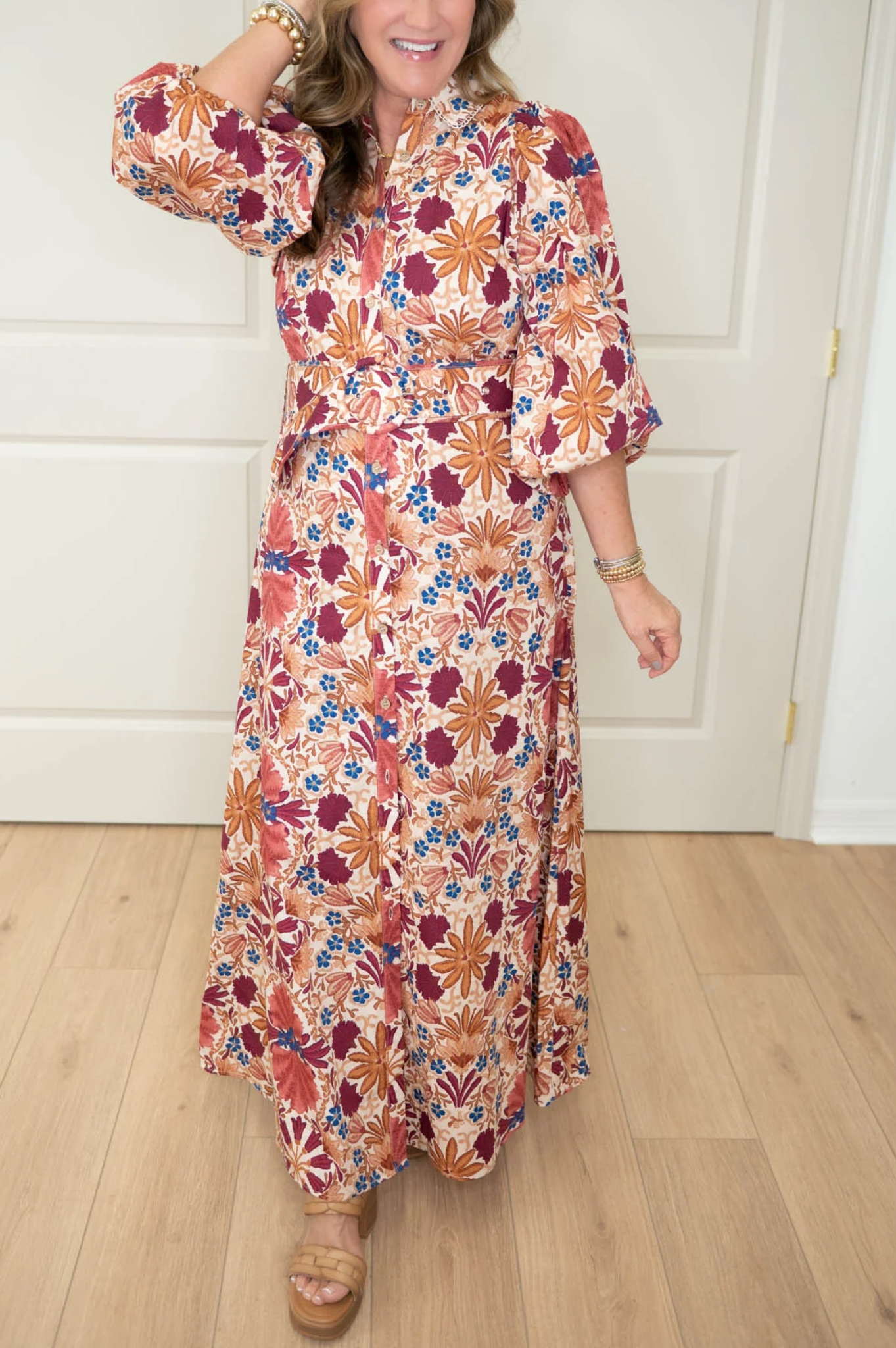 Elegant and vibrant, this maxi dress is a beautiful fusion of bohemian charm and sophisticated style. The rich, colorful floral pattern in warm hues is eye - catching, while the balloon sleeves and waist tie add a touch of femininity and grace. Perfect for both casual outings and special occasions, it effortlessly combines comfort with a chic, artistic flair.