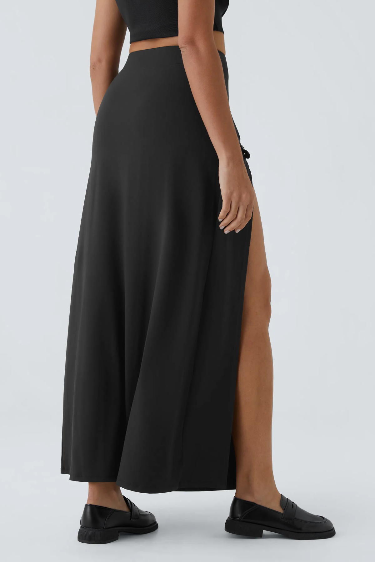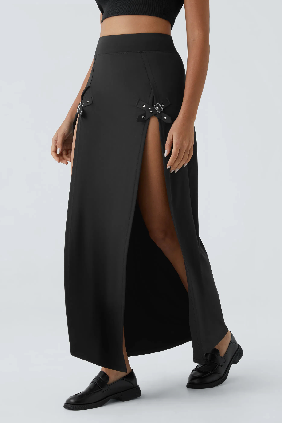 Elevate your casual wardrobe with this High Waisted Decorative Buckle 2-in-1 Maxi Skirt. Crafted in sleek black, the high-waisted design flatters your silhouette, while the bold double slits (accented with edgy metal buckles) add a modern, statement-making touch. The versatile "2-in-1" style works as a flowy maxi skirt for relaxed outings or can be styled for edgier looks—paired with a crop top (like shown) for a chic vibe, or a tucked-in tee for casual cool. Soft, lightweight fabric ensures all-day comfort, making it a go-to piece for any occasion.