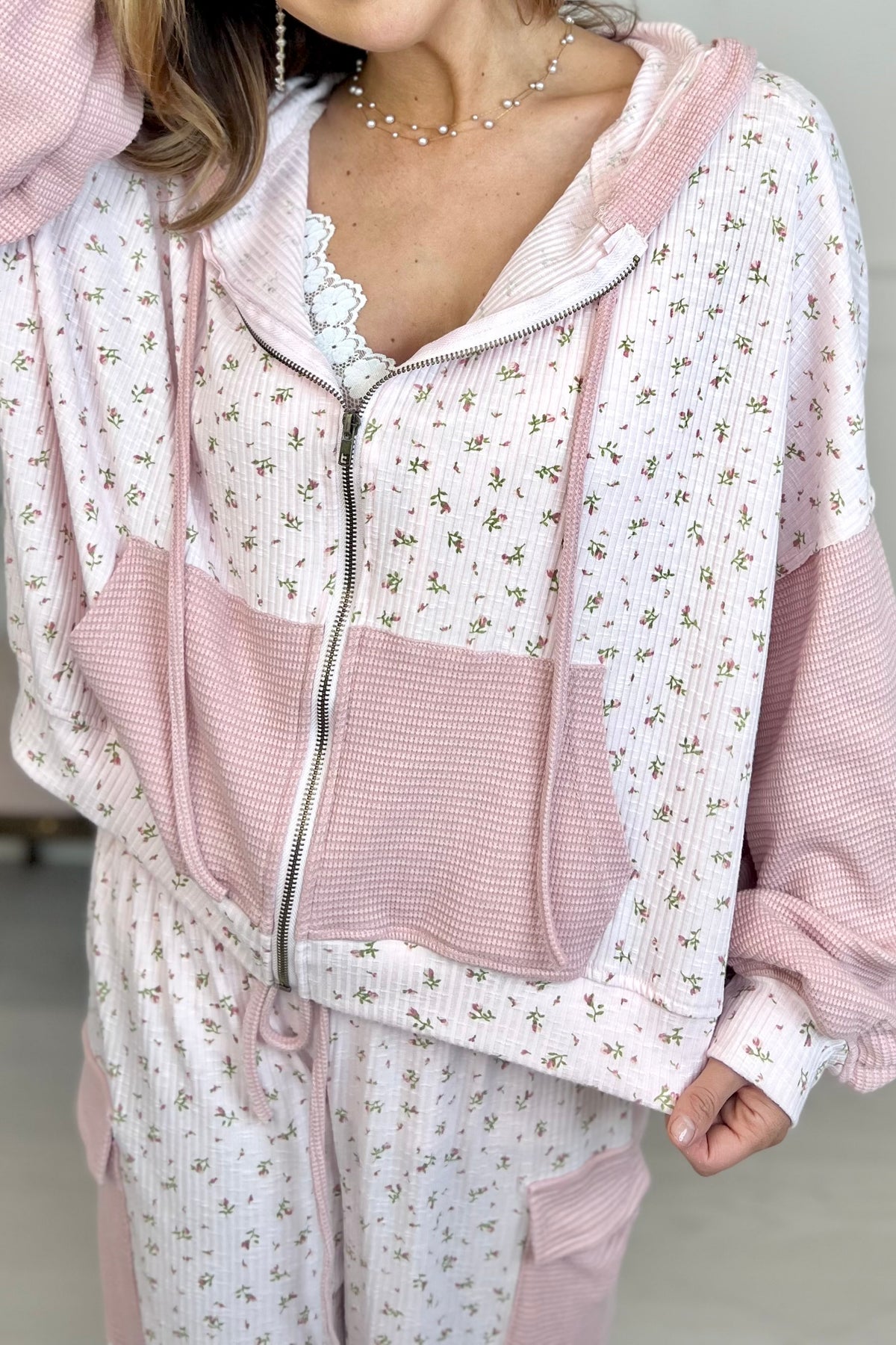 The hood and zipper add a sporty feel, while the floral elements lend a sweet and romantic touch. This clever fusion of styles caters to a wide range of outfits. With a soft pink as the primary color, paired with delicate floral patterns, the top is visually fresh and elegant, creating a gentle and sweet atmosphere that is particularly appealing to women.