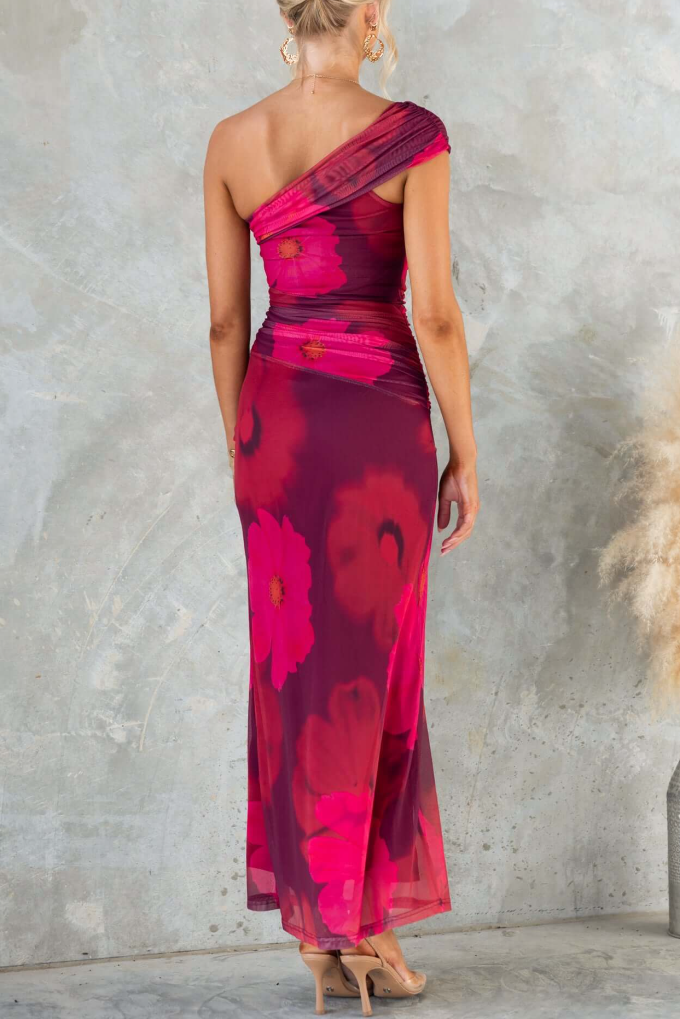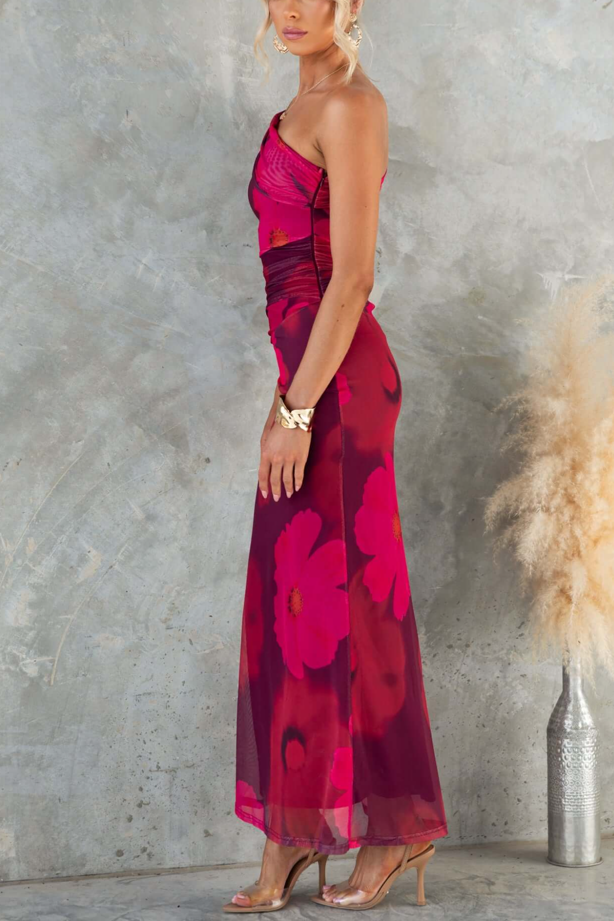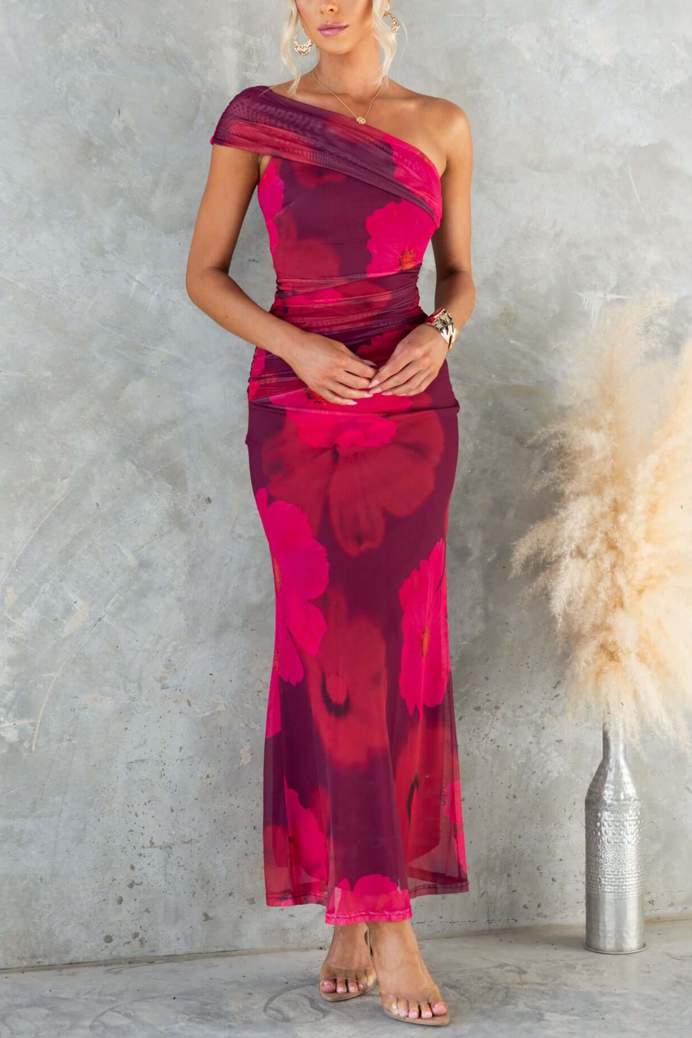 This one-shoulder midi dress exudes bold elegance: deep burgundy base with vivid fuchsia floral prints, plus sheer overlay detail for a touch of allure. The ruched fabric hugs the silhouette beautifully, making it perfect for cocktail parties, date nights, or formal dinners. Pair it with gold accessories (like shown) and strappy heels for a sophisticated, head-turning look that balances romance and glamour.