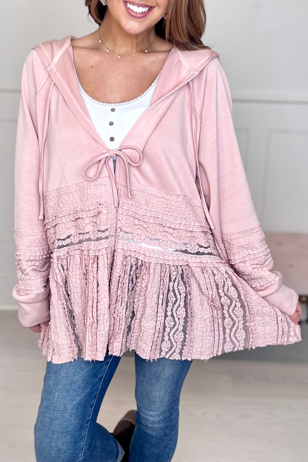 The casual hooded element is cleverly combined with the romantic lace and pleated design, which has a casual and casual feeling while retaining a sweet and elegant temperament. The style is unique and diverse. The tie design of the neckline adds a playful feeling. The large amount of lace splicing and pleating on the body of the top is rich in layers and full of exquisiteness, making the top more visually attractive.