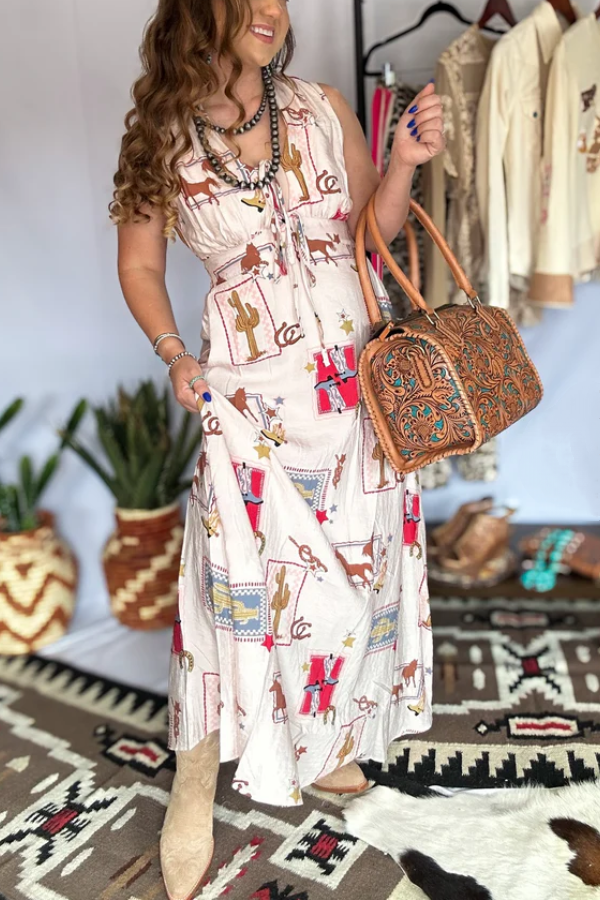 This one’s made for the cowgirl who lives for wild skies, desert blooms, and that wide-open Western spirit. The Prairie Postcard Maxi Dress is a storybook in fabric—playful prints of broncs, boots, cacti, and stars dance across soft cream cotton like snapshots from a dusty postcard home. With a flowy, flattering cut and vintage-inspired tie neckline, this dress is ready for everything from Sunday brunch to a slow dance at golden hour.