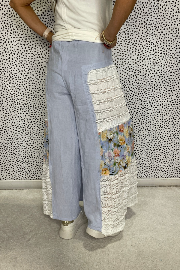A drawstring waistband allows for easy adjustment to fit any waist size. The wide-leg silhouette flatters your legs and creates a graceful, elegant look. Lace and printed accents add a touch of sophistication and romance. The fabric is soft and breathable, making it suitable for all seasons. The textured lace and printed fabric provide a comfortable and stylish fit.