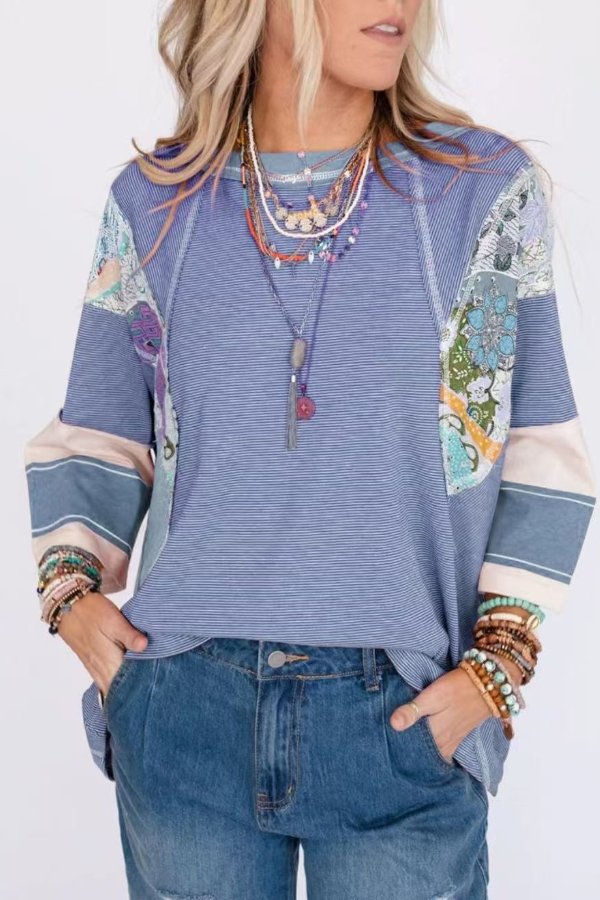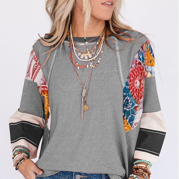This design, featuring a patchwork of stripes and colorful printed fabrics, creates a vibrant and artistic impact, breaking the monotony of conventional tops and showcasing a unique and stylish personality, making it a standout piece. The loose fit provides a relaxed fit that accommodates a wide range of body shapes while creating a relaxed, relaxed vibe, perfect for everyday wear or outings.