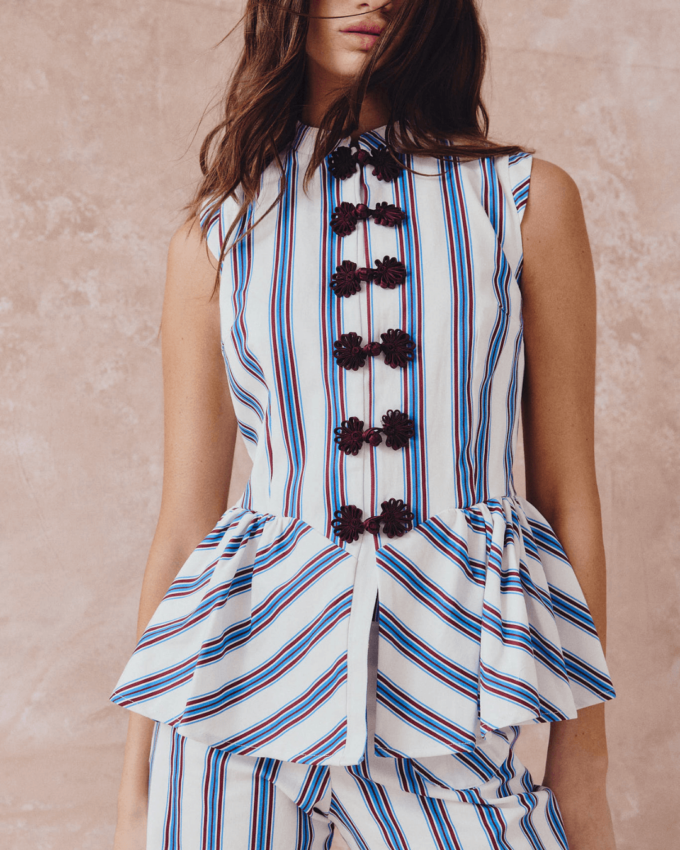 Details that Make the Difference: The Shanghai Riviera Vest is a garment with mandarin collar, shoulder piece to stylize the figure, flared waist cut and authentic Cheongsam buttons. It is a unique garment as it is inspired by the traditional Chinese Cheongsam suits and tailoring of the 50s.
