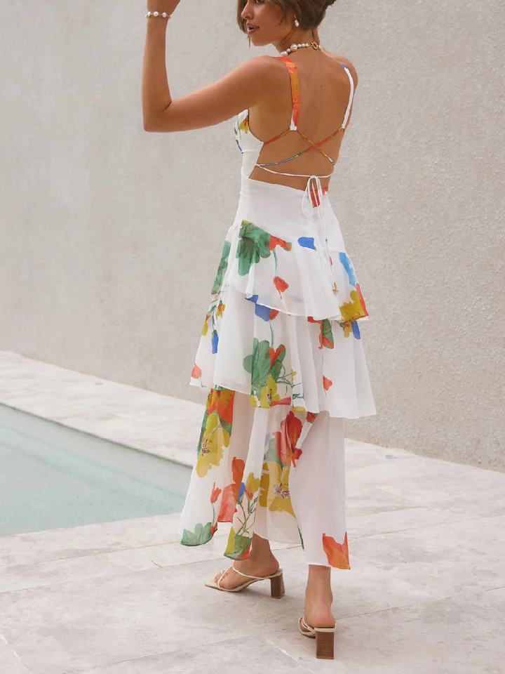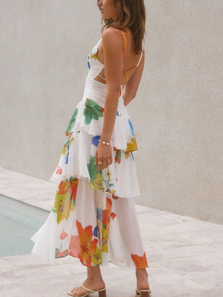 Jaws will drop when you float by in our gorgeous dress. With its pretty, tiered ruffles and strappy back, it's fit for a princess. Perfect for a flirty first date teamed with mules and a tote for a dreamy look.