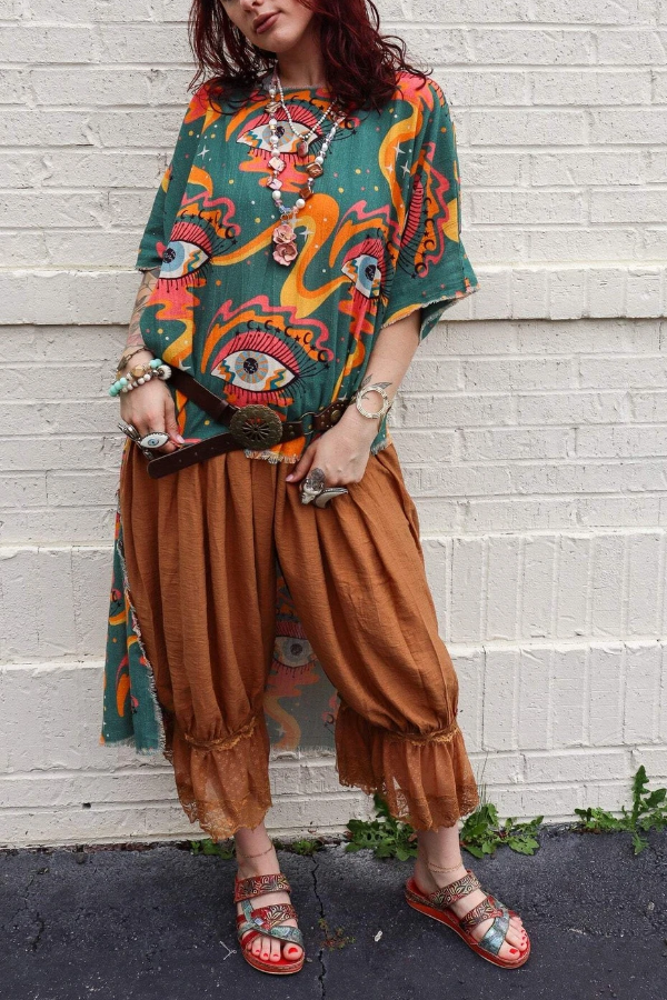 With its breezy lightweight fit, raw edge detailing, and whimsical front appliqué patch, this tunic blends comfort with creativity. The flattering hi-lo hem adds movement and flow — perfect for festivals, brunch dates, or just living your boldest life.