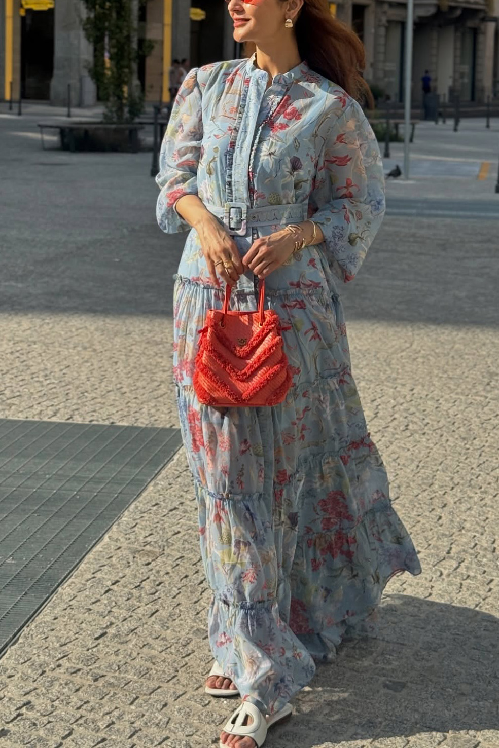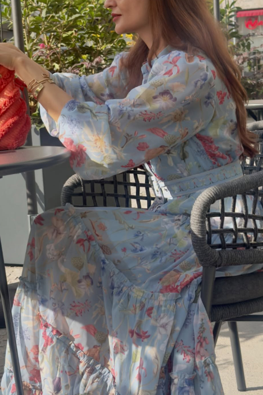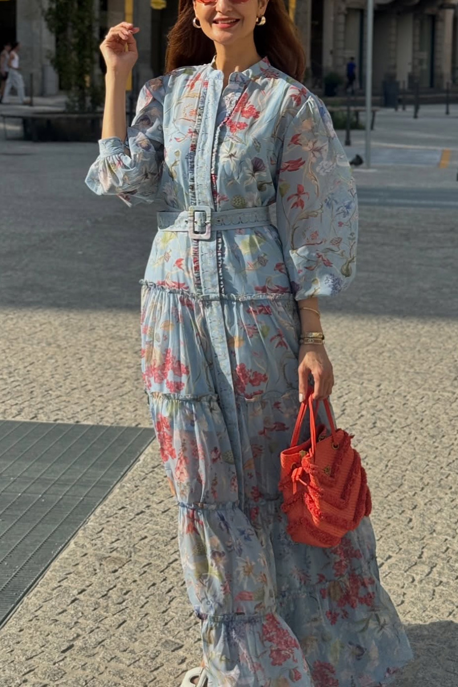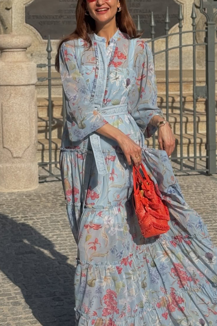 Dreamy and refined, this light blue floral - printed maxi dress is a beautiful combination of bohemian charm and elegant grace. The sheer, flowing fabric adorned with vibrant floral patterns feels exquisitely airy, while the tiered design and matching belt add a touch of structure and femininity.