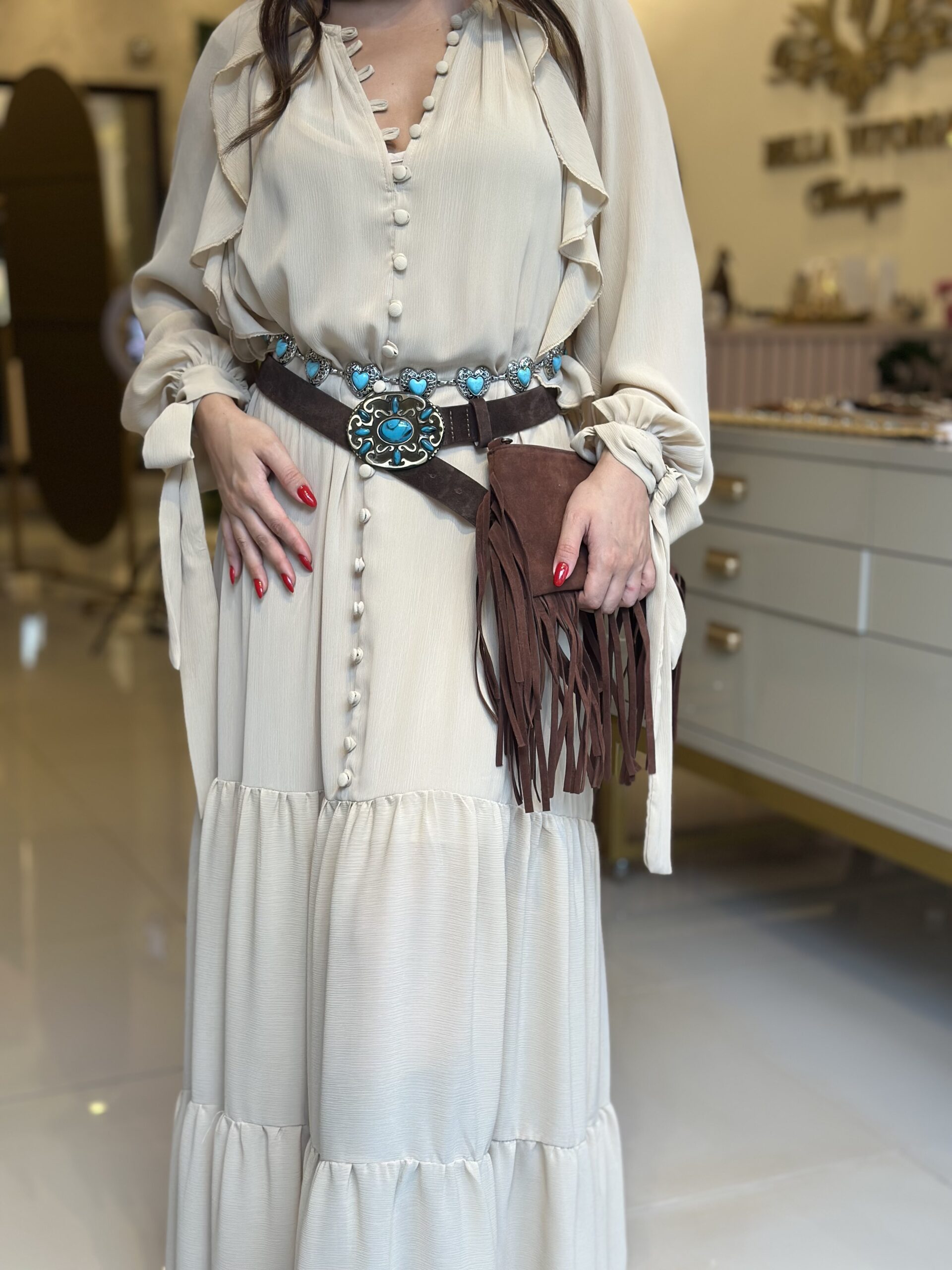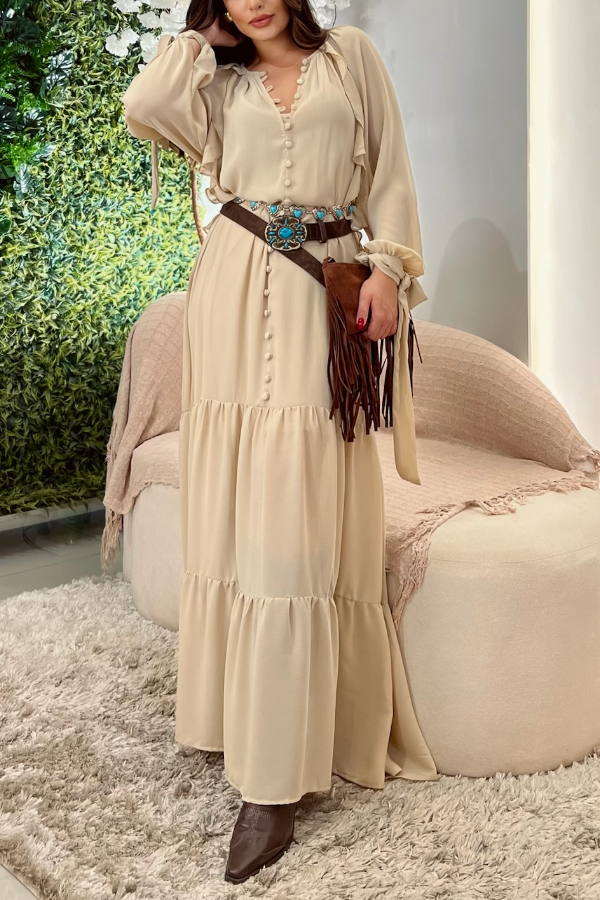 The deep V-neck combined with the button design is sexy and retro; the large skirt with multiple layers of ruffles is graceful and flowing when walking, showing a romantic style.