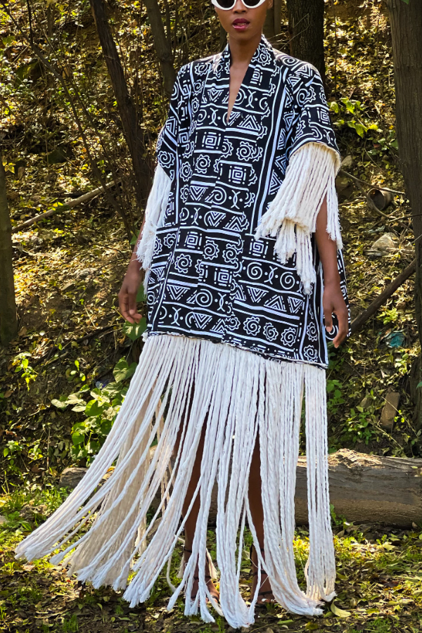 The garment is adorned with black and white geometric and totemic prints, rich in ethnic characteristics. The exquisite patterns and rich cultural heritage instantly create a unique and exotic atmosphere. The classic black and white color scheme is simple yet sophisticated, easily paired with other items, and timeless, making it a stylish statement for everyday wear and special occasions.