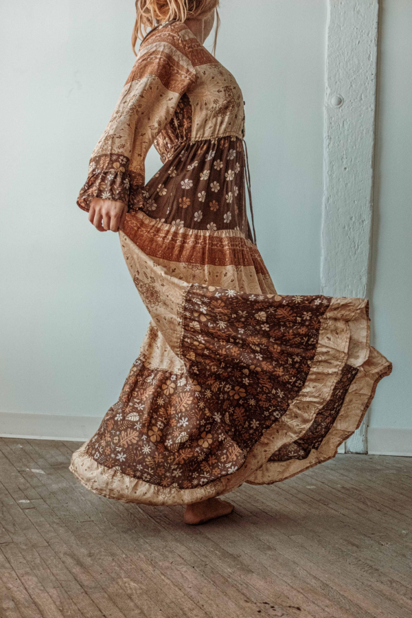 This fusion of bohemian and retro styles creates a relaxed yet nostalgic style, perfectly embracing the current trend towards retro fashion and individuality. The flared sleeves create a retro feel, adding a sense of movement and visual depth to the outfit, creating a graceful and flowing look. A variety of retro floral and geometric patterns, predominantly earth tones, create a rich and harmonious retro feel. Each pattern showcases a unique artistry, ensuring a rare pairing.