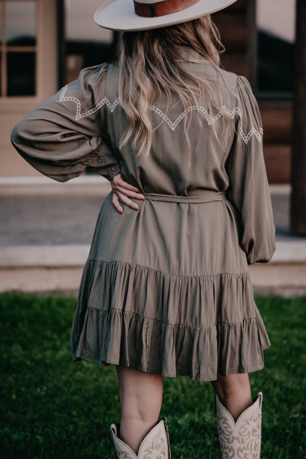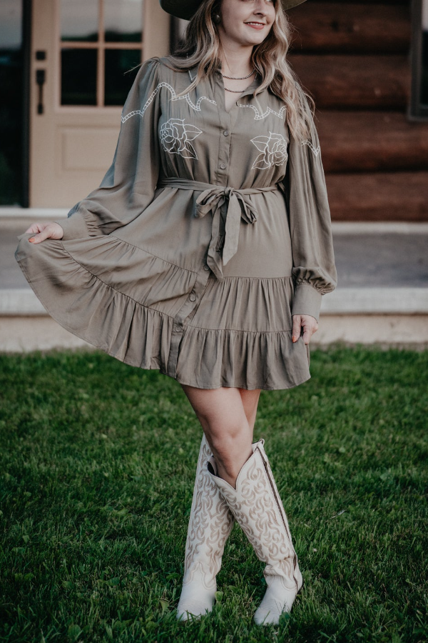 The low-saturation, muted olive green combined with Western-style embroidery (roses + geometric patterns) blends the cool, edgy vibe of denim with a touch of softness, creating a relaxed and understated atmosphere. The shirt dress silhouette and wide-brimmed hat are a perfect match, effortlessly creating a casual American countryside look. The belt cinches the waist for a flattering silhouette, or can be left undone for a relaxed, oversized feel, making this dress versatile enough for different styles.