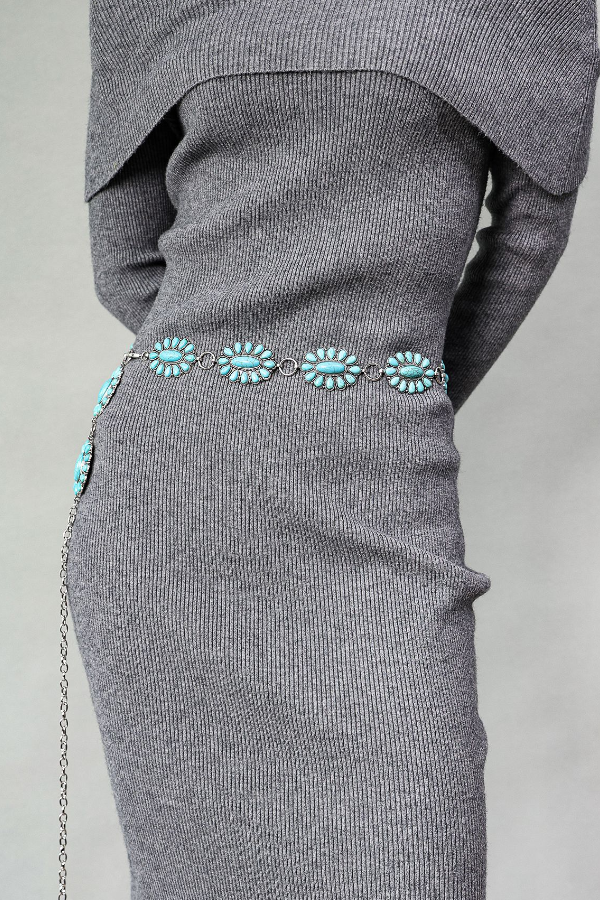 Adjustable belt (with hook closure) One size fits all Belt main body length: 31 inches Extension length: 10.5 inches Matching waist chain and earrings included SKU: ACSY25122311